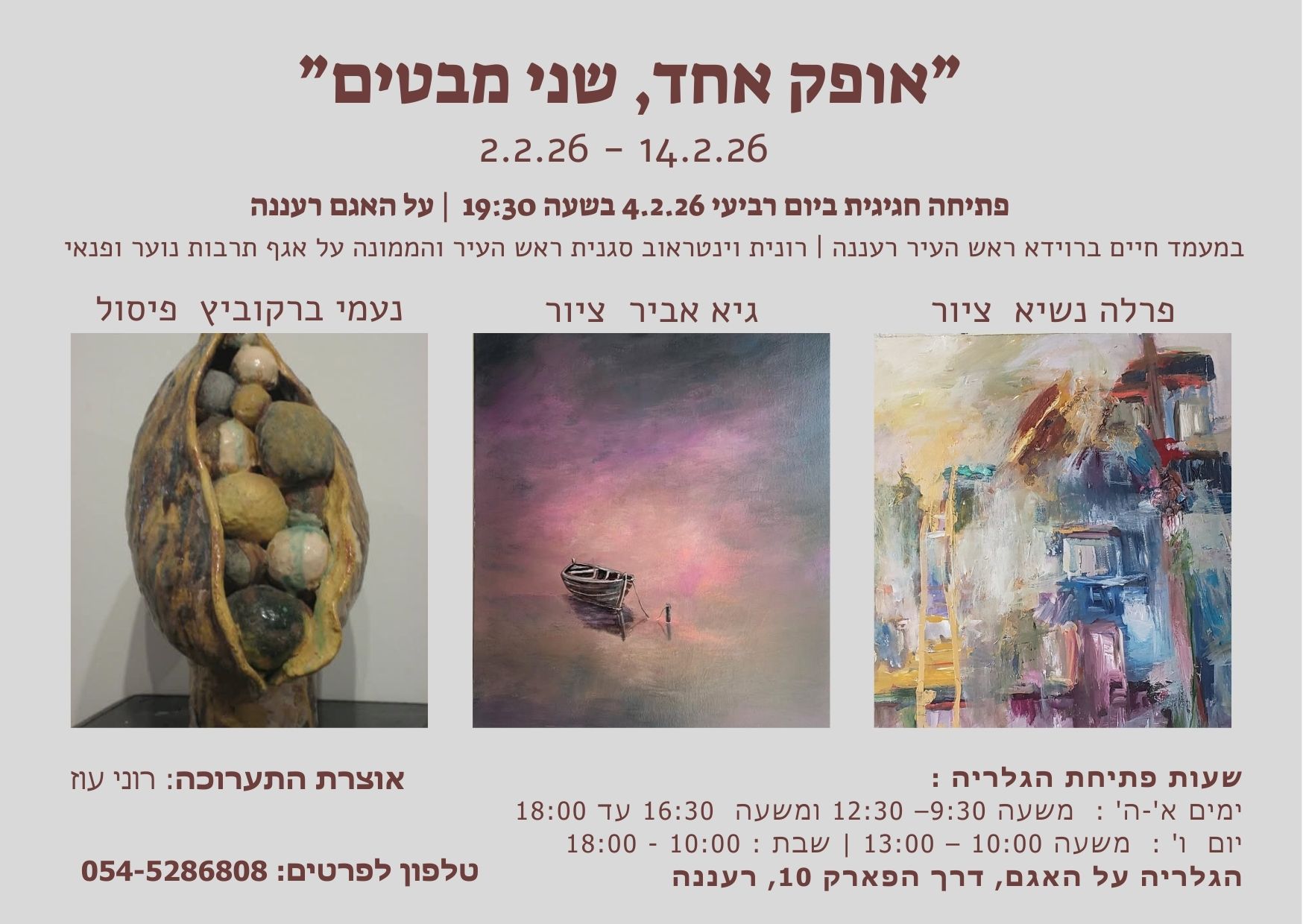 ״אופק אחד, שני מבטים״ בוחנת את המפגש הפורה בין ריאליזם להפשטה, ובין תפיסה חזותית לחוויה פנימית. שלושת האמנים מציעים שפות אמנותיות שונות המתכנסות לאותו מרחב משותף.